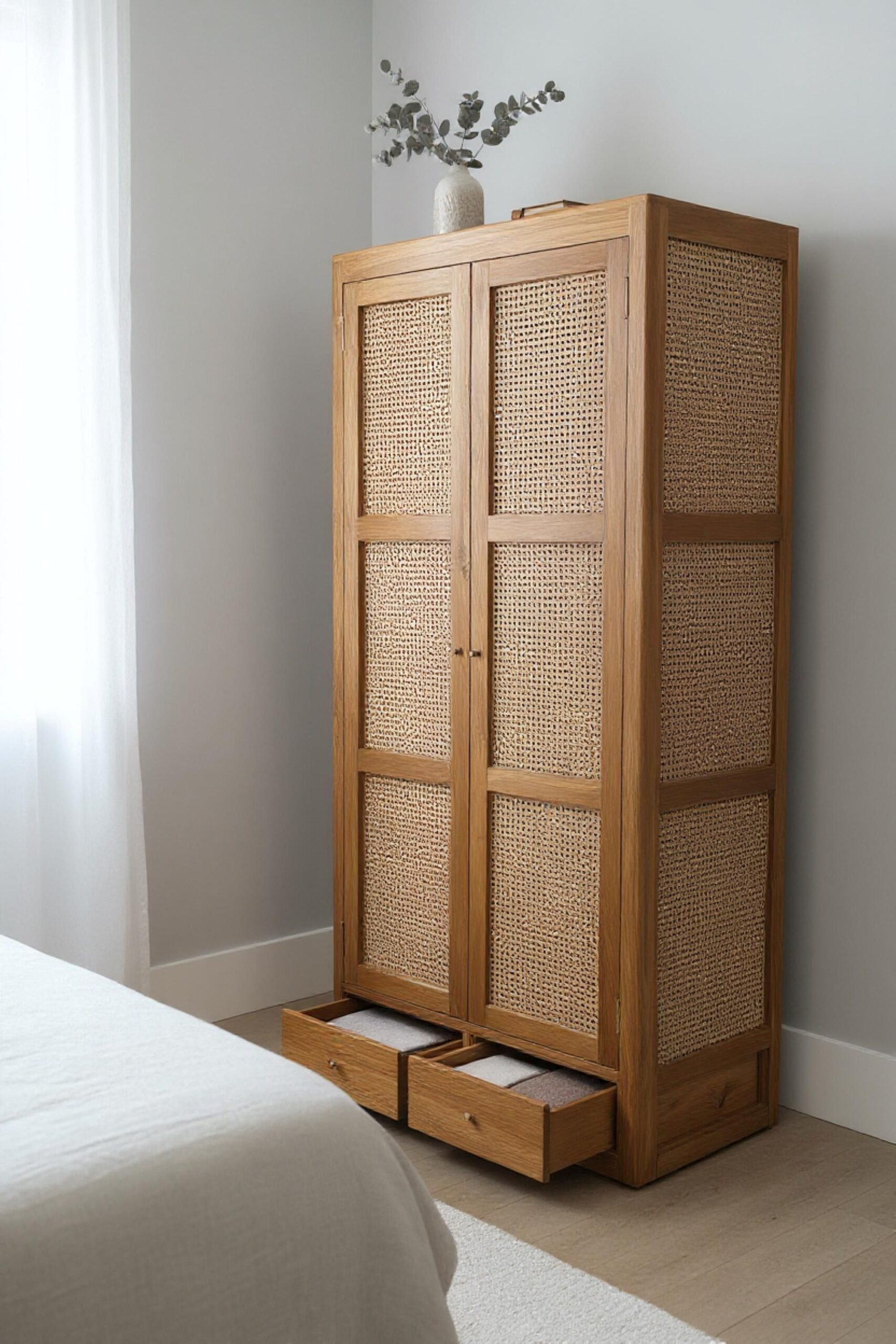 Teak Wood and natural rattan makes for a gorgeous combination and completely practical too. Plenty of space on the inside. Features double doors and 3 shelves 2 drawers.