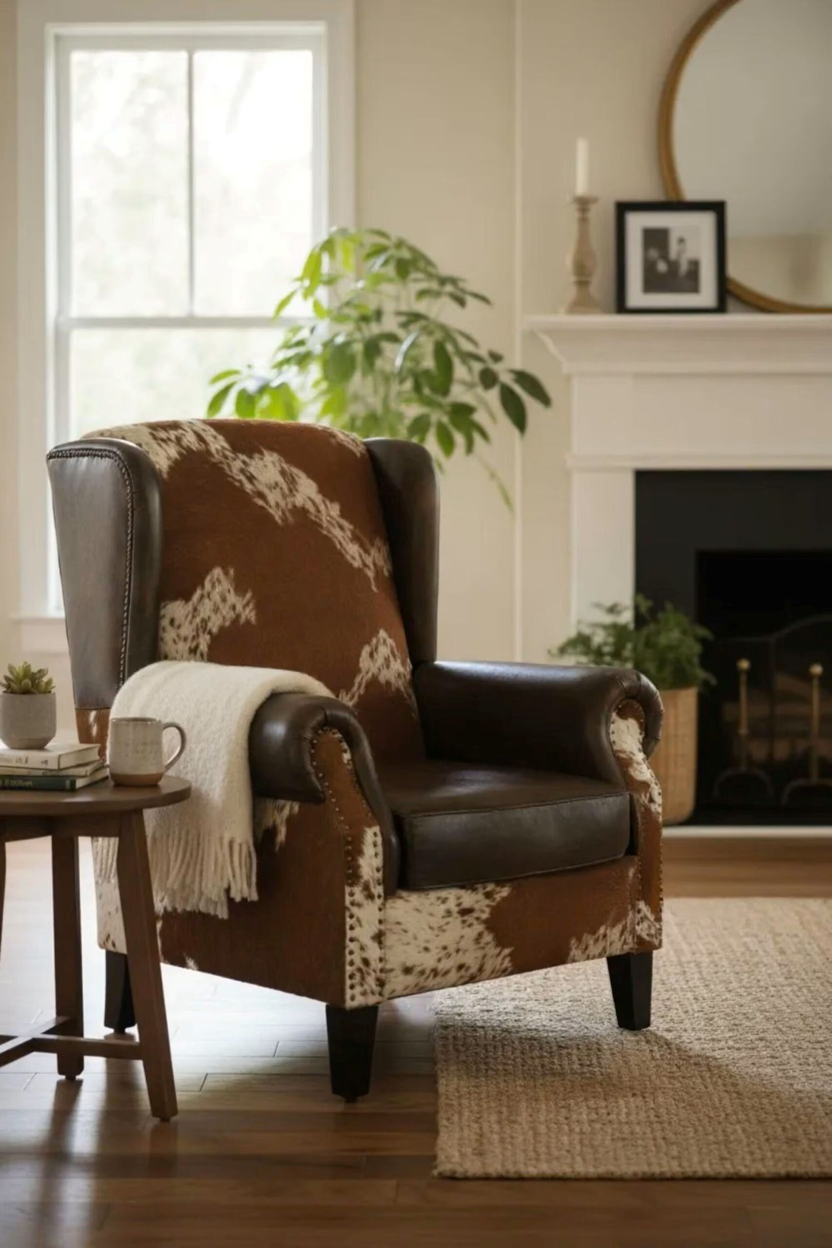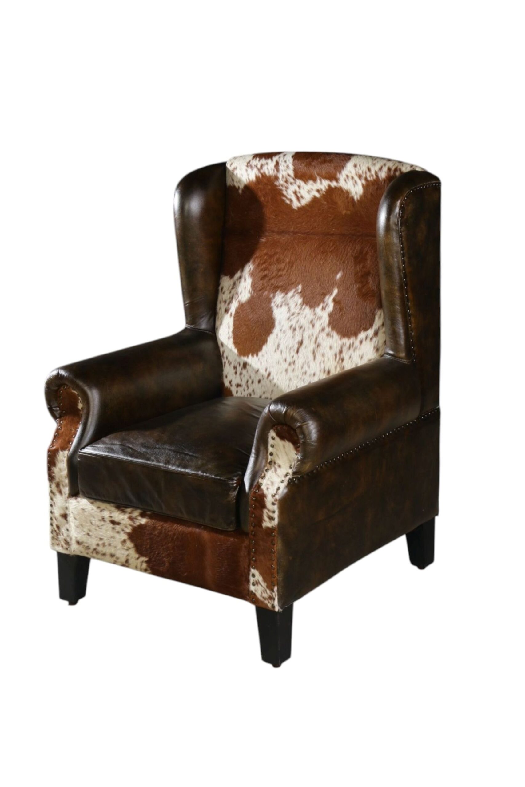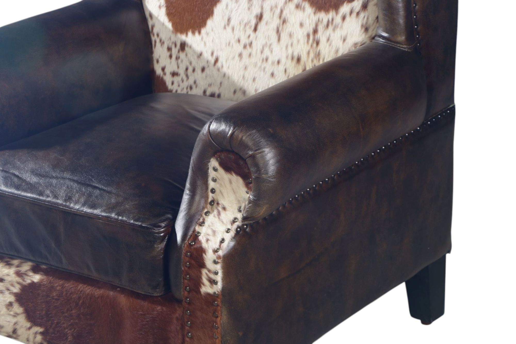 Southwestern Wingback Leather Lounge Chair Brown and white Natural hide With Dark Leather Seating Office Den Living Room Accent Western