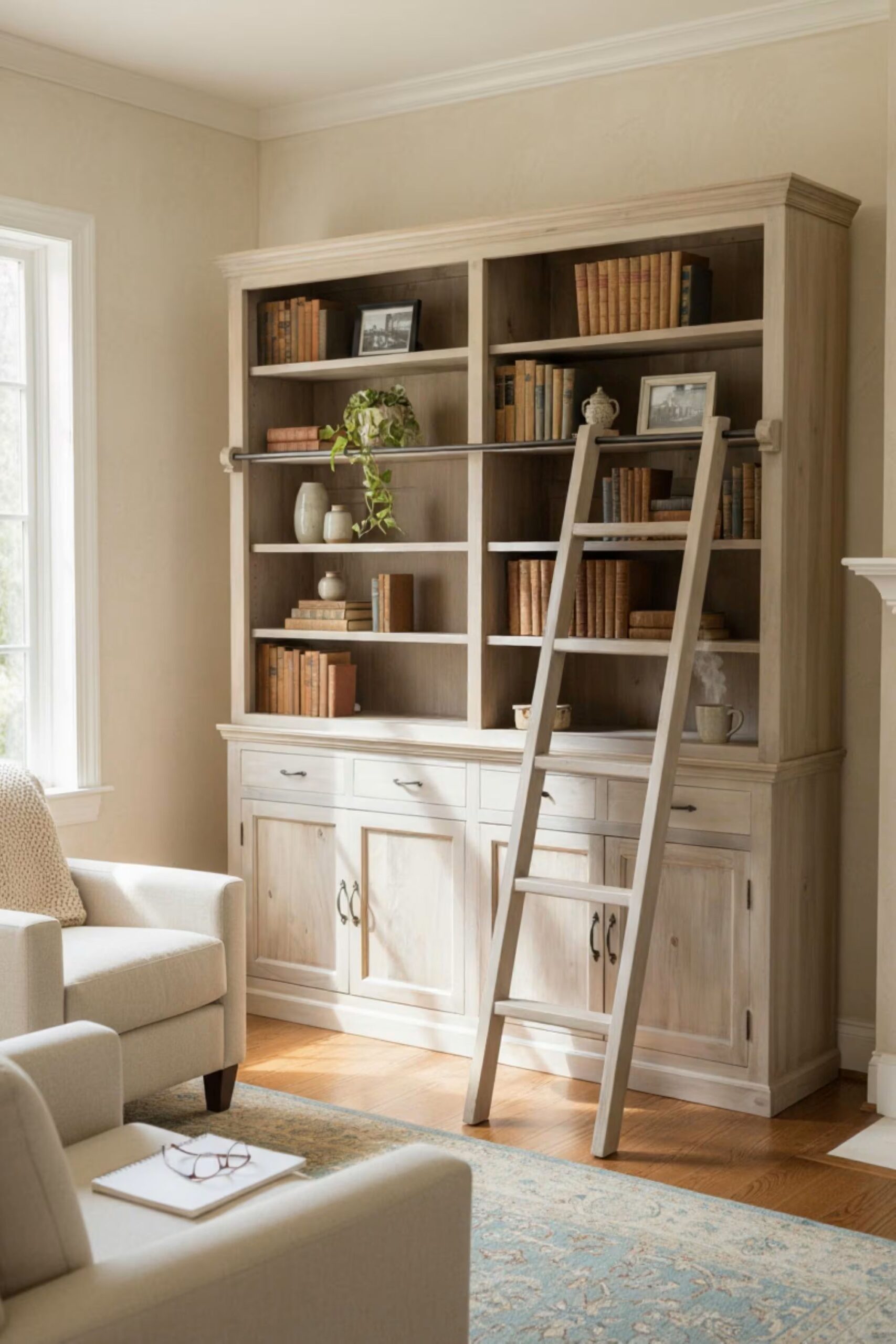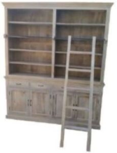 Beautifully handcrafted from solid wood. This Gorgeous 2-piece Library Hutch offers 4 Drawers, 4 Doors with spacious shelving for extra hidden storage space, open shelving for display and a sliding ladder. Would make a lovely addition to your home.